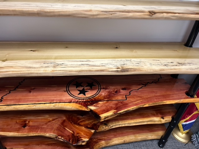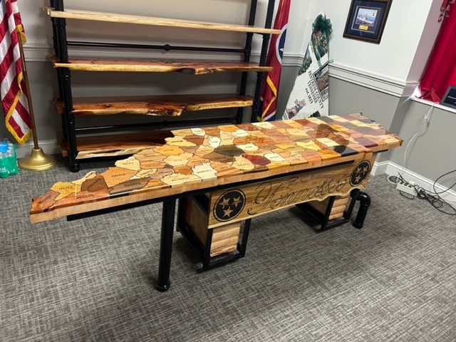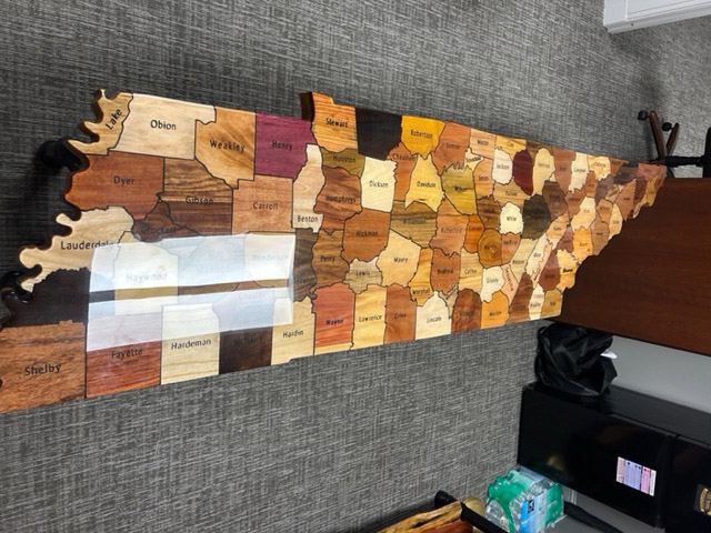 In November, 2022 our oldest son, Ed Butler II, was elected Representative of the 41st Congressional District of the State of Tennessee. One of the items the state provides each senator and representative is a large map of their district. They will also provide a very common looking frame for these maps. Being raised by someone that loves and admires beautiful woods he asked me to use my creative imagination and build him a custom frame for his copy of the map. This frame is a bit over 65 inches long by a little over 52 inches high. That is roughly five and a half feet by four and a half feet.
